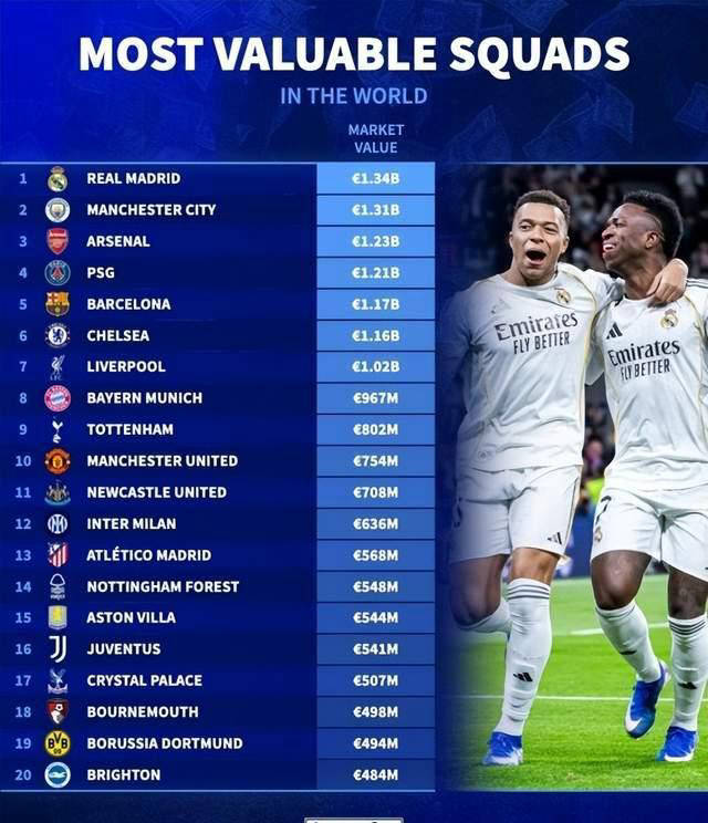 此外,根据德国转会市场最新发布的球队身价排行榜,豪门俱乐部经济实力再次显现。皇马以13.4亿欧元居首,曼城紧随其后13.1亿欧元,阿森纳以12.3亿欧元位列第三,巴黎圣日耳曼和巴萨也同处顶尖行列。而国际米兰仅排到第12位,身价为6.36亿欧元,远远落后于欧洲顶级俱乐部。